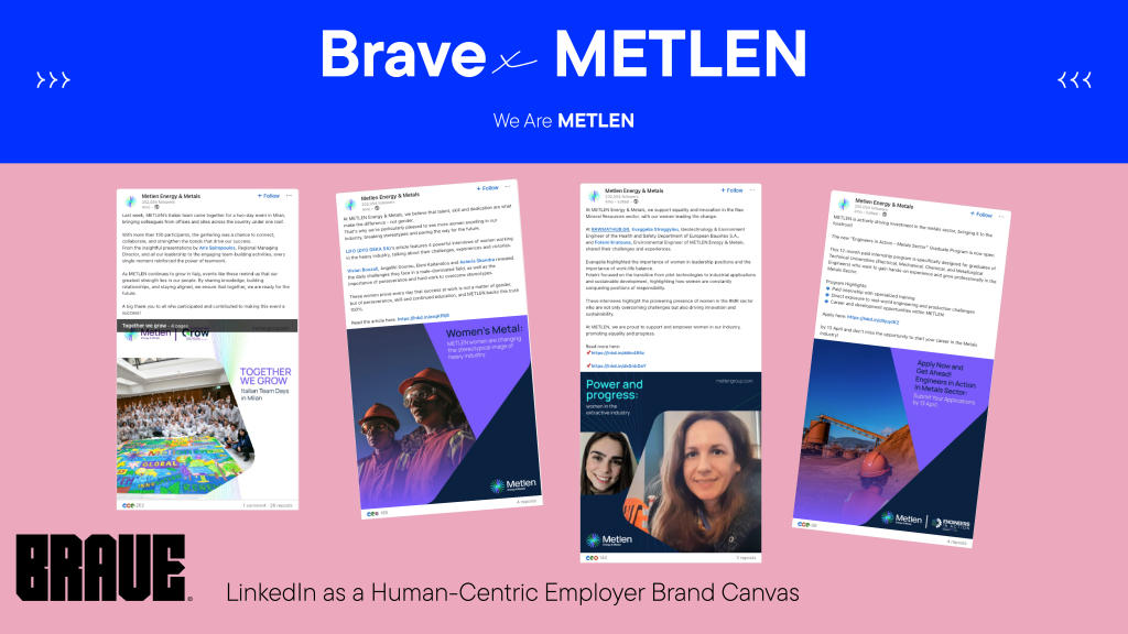 Η METLEN Energy & Metals προσέγγισε το LinkedIn όχι ως εργαλείο “αγγελιών”, αλλά ως στρατηγική πλατφόρμα για την ανάδειξη της εργοδοτικής της ταυτότητας (Employer Value Proposition). Με μια πολυφωνική και συμμετοχική προσέγγιση, η εταιρεία παρουσίασε την κουλτούρα της μέσα από τις φωνές των ίδιων των εργαζομένων, την κοινωνική αξία της τεχνογνωσίας της και την καθημερινότητα στον βιομηχανικό χώρο. Χωρίς χρήση paid media, η καμπάνια κατέγραψε 248.871 οργανικά impressions, engagement rate 4,6% και αύξηση 55% στις αιτήσεις εργασίας από LinkedIn. Η METLEN έθεσε νέα πρότυπα στρατηγικής επικοινωνίας για τον βιομηχανικό εργοδότη του αύριο.